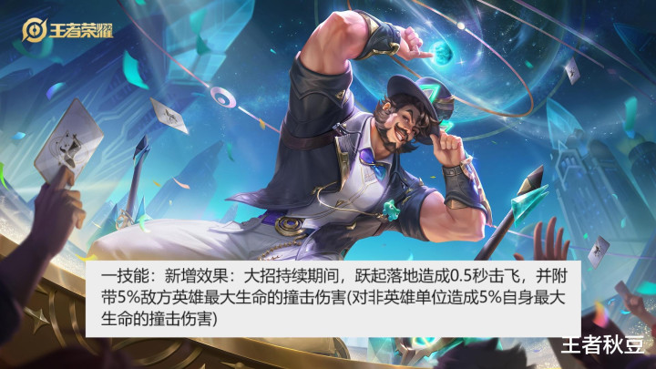 程咬金一工夫新增大招时候跃起落地形成0.5秒的击飞,纯加强。程咬金也能开团了,实测起手前摇比赵云和亚瑟的击飞皆快,敌方很难反馈过来,一般大招时候不错用2次。比较抢先服,附带的最大生命撞击伤害从4%陶冶到5%,进一步陶冶了程咬金的伤害。