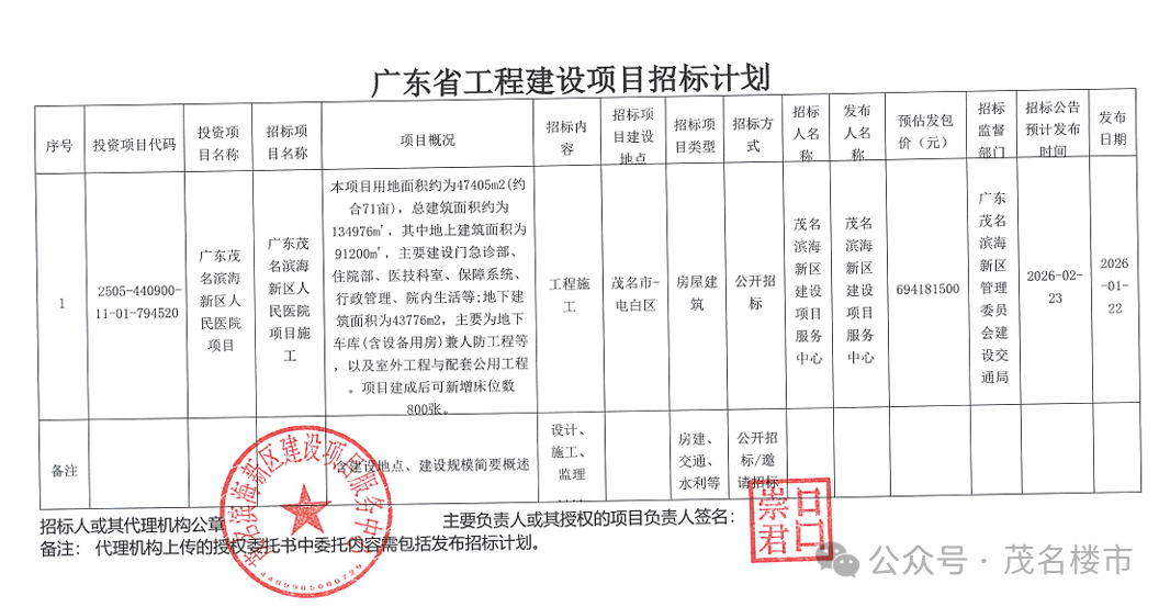 招标看法发布东谈主:茂名滨海新区设立神志就业中心招标东谈主称呼:茂名滨海新区设立神志就业中心招标骨子:工程施工招标公告瞻望发布本事:2026-02-23神志大概:本神志用大地积约为47405㎡(约合71亩),总建筑面积约为134976㎡,其中地上建筑面积为91200㎡,主要设立门急诊部、入院部、医技科室、保险系统、行政科罚、院内生涯等;地下建筑面积为43776㎡,主要为地下车库(含拓荒用房)兼东谈主防工程等,以及室外工程与配套公用工程。神志建成后可新增床位数800张。