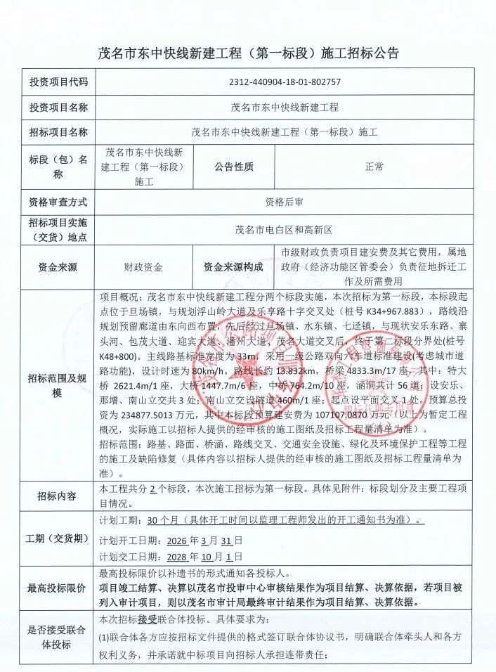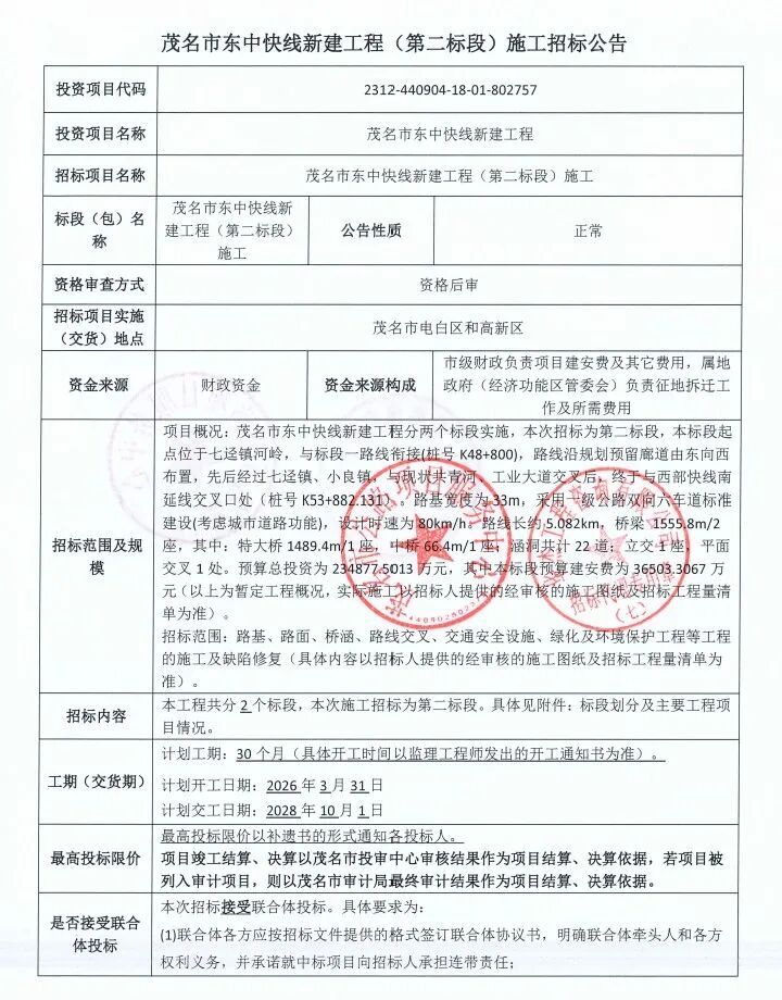 近日,广东省宇宙资源交游平台发布了茂名市东中快线新建工程施工招标公告,工程分为第一标段和第二标段。