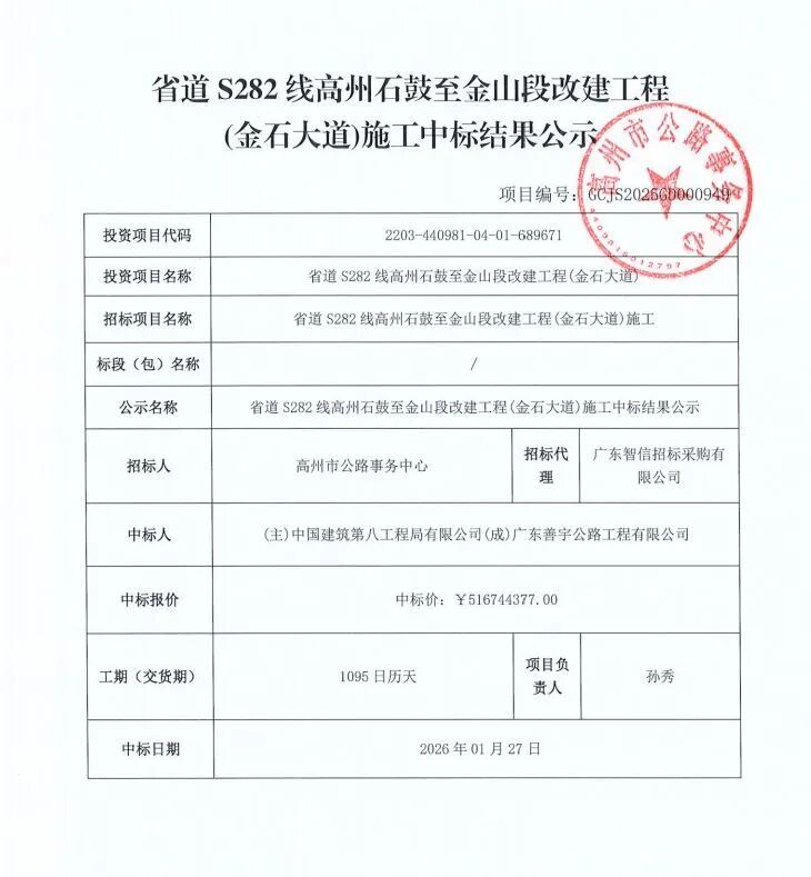 近日,广东省宇宙资源交游平台发布了《省谈S282线高州石饱读至金山段改建工程(金石大路)施工中标后果公示》,PG电子(PocketGames)游戏官网中标东谈主为:(主)中国建筑第八工程局有限公司(成)广东善宇公路工程有限公司,中标价516744377元,工期1095日期天。