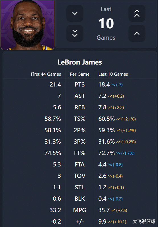 数据不会说谎,在詹姆斯伤愈复出的这10场比赛中,湖东说念主获取了9胜1负的战绩,阵容如虹。而老詹亦然找到了一个很好的均衡点,麻将胡了游戏下载当东契奇和里夫斯在场且状况火热时,他退居幕后、干好三住持的活,而当球队需要他站出来时,黝黑麇集力量的他就会挺身而出、责无旁贷。这10场球,老詹场均孝敬18.4分7.8篮板7.2助攻1.2抢断,乍一看场均得分有所下滑,但胜在愈加全面,和赛季的前44场球比较,场均得分确乎下落了3分,但射中率高潮了1.2个百分点,真实射中率升迁2.1%,场均助攻上升0.2,场均篮板上升2.2个,个东说念主正负值则是从-0.2飙升至9.9。一句话概述即是,詹姆斯打得愈加高效也愈加合理了,昭彰他很相宜新的定位、新的脚色。