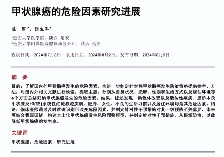 [1]焦丽, 张生军. 甲状腺癌的危机因素预见贯通[J]. 临床医学贯通, 2024, 14(8): 400-406.