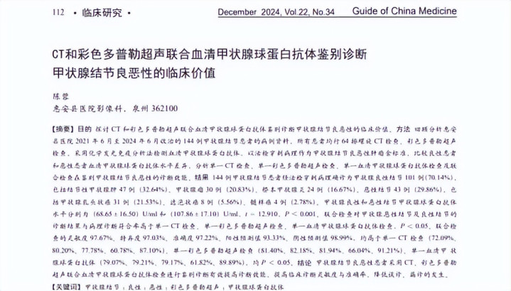 [1]陈蓉,CT和彩色多普勒超声吞并血清甲状腺球卵白抗体阔别会诊 甲状腺结节良恶性的临床价值,2024-12-06