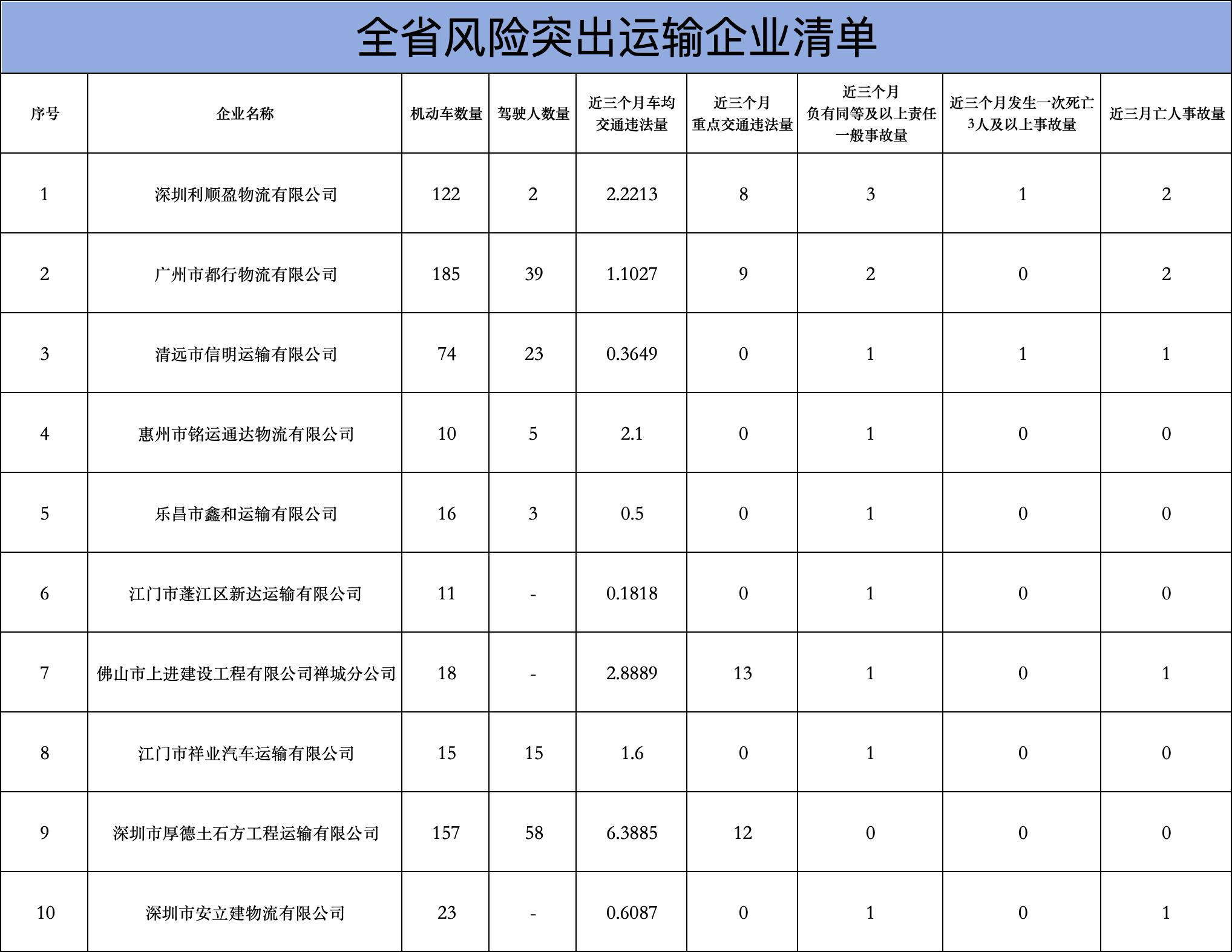 岁末年终,跟着动力保供、民生保险等物质输送需求鼎沸,客货输送交汇重叠,要点区域、要紧通说念流量扶持,星空体育官网说念路客货输送将捏续保捏高位运转。经排查,这次曝光的风险超过输送企业共10家,包括深圳利顺盈物流有限公司、广州市王人行物流有限公司、清远市信明输送有限公司、惠州市铭运清爽物流有限公司、乐昌市鑫和输送有限公司、江门市蓬江区新达输送有限公司、佛山市上进建立工程有限公司禅城分公司、江门市祥业汽车输送有限公司、深圳市厚德土石方工程输送有限公司、深圳市安立建物流有限公司。其中,深圳利顺盈物流有限公司、清远市信明输送有限公司等单元近三个月发生了要点输送车辆惹事导致的较大交通事故,广州市王人行物流有限公司发生要点输送车辆负沿途梗概主责的一火东说念主交通事故。